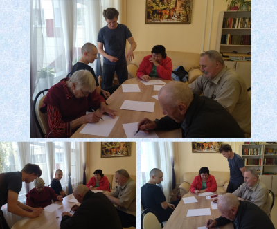 В ходе этого занятия проживающие давали определение понятию стресс, затем было предложено изобразить композицию «Я и стресс» в образной или абстрактной форме и пояснить, что именно они нарисовали.
