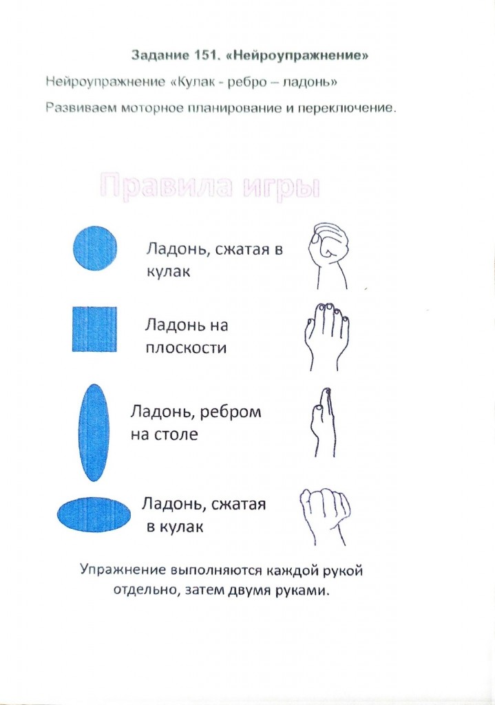Упражнение «Кулак, ладонь, ребро» направлено на развитие памяти, концентрацию внимания, синхронную работу верхних конечностей. Это упражнение улучшает мыслительную деятельность, синхронизирует работу полушарий, способствует запоминанию, повышает устойчивость внимания, активирует процесс письма и чтения.