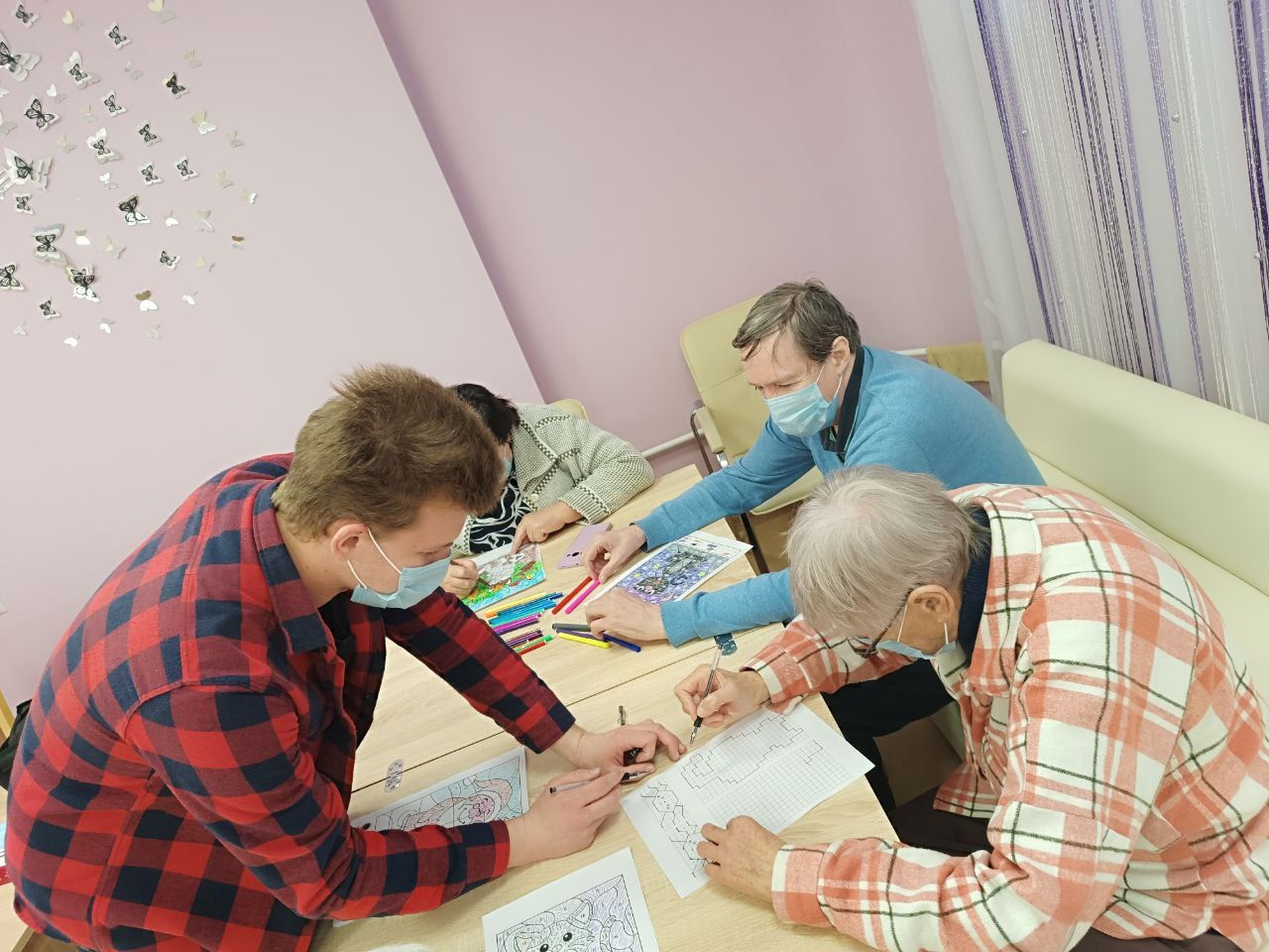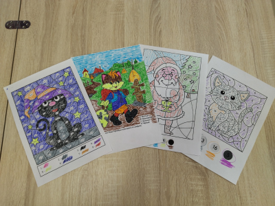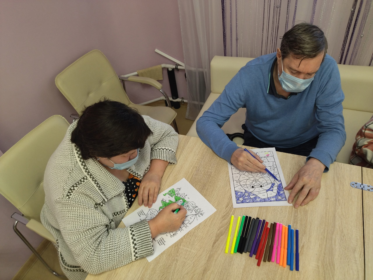 На этом занятии пожилым людям предлагалось раскрасить по номерам картинки и решить арифметические задачи. Суть метода заключалась в том, что каждая цифра на раскраске соответствовала определенному математическому примеру. Решив его, проживающие узнавали, каким цветом нужно закрасить соответствующий участок. Уровень сложности задач варьировался, позволяя каждому выбрать задание по силам.